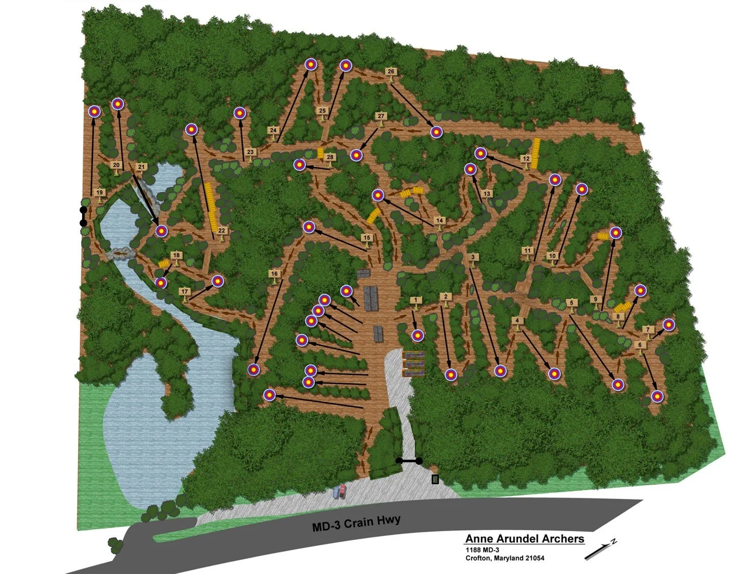 For the last 40 years, Anne Arundel Archers has been located in Gambrills, Maryland, on 53 acres of county land open all year dawn to dusk between Route 3 South and the little Patuxent River (also known as Patuxent River Conways Park) which includes a lot of swamp land. The range follows county park regulations; Open dawn to dusk; Open parking in front; There are no lights after dark; There are no life guards; No phones or internet services; And, due to the fire hazard no Smoking and no open fires or barbeques. Lastly, there is no hunting on County property at any time.